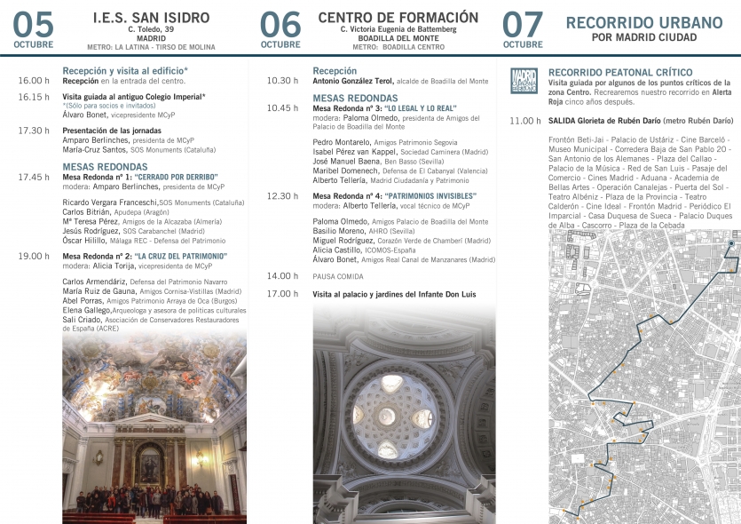 Madrid Ciudadanía y Patrimonio se suma a estos encuentros nacionales, organizando esta XIV edición, con la colaboración especial de SOS Monuments, una de las entidades promotoras de esta ya habitual cita anual, y cuya última edición fue el año pasado en Pamplona, y de la Asociación de Amigos del Palacio de Boadilla, que serán nuestros anfitriones el segundo día.