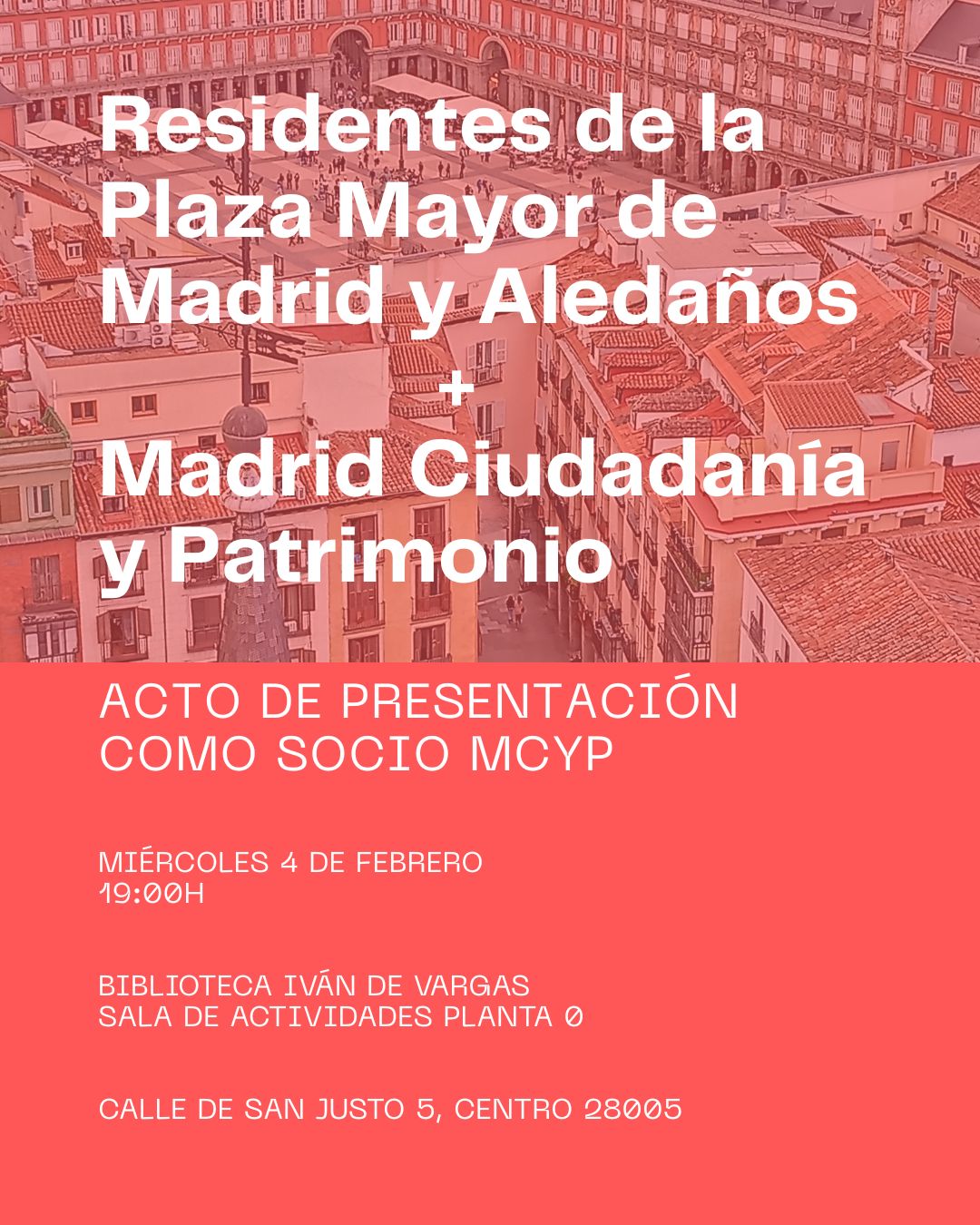 El próximo miércoles 4 de febrero a las 19:00 horas, en la Sala de Actividades de la Biblioteca Iván de Vargas, (calle San Justo, nº 5) se celebrará un acto entre los Residentes de la Plaza Mayor de Madrid y Aledaños + Madrid Ciudadanía y Patrimonio que servirá para celebrar la incorporación de la asociación vecinal de los primeros en la segunda.